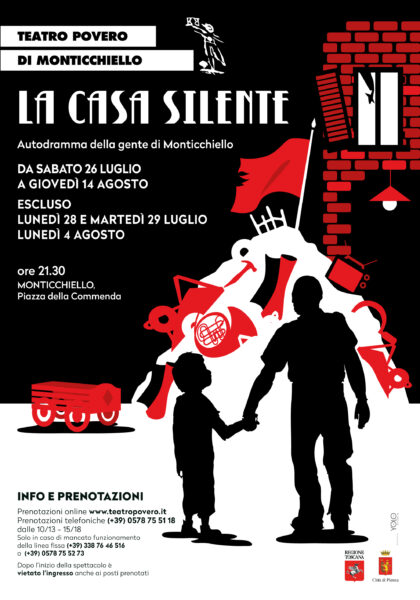 Da sabato 26 luglio a giovedì 14 agosto sarà ‘in piazza e in scena’ il 59° autodramma del Teatro Povero di Monticchiello, “LA CASA SILENTE”. Una drammaturgia partecipata da un intero paese che si interroga su questioni cruciali per la comunità e in cui chi guarda può di riflesso riconoscersi e ritrovarsi. Tradizione sperimentale che ogni anno propone un nuovo testo, lo spettacolo del Teatro Povero di Monticchiello è ideato, discusso e recitato dagli abitanti attori. Ogni estate ‘in piazza’ nel caratteristico borgo della Val d’Orcia.
